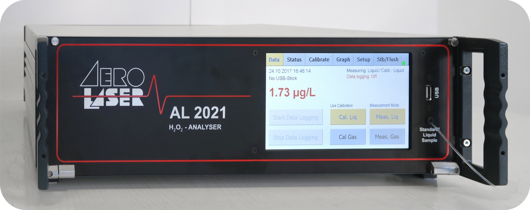 The hydrogen peroxide (H2O2) monitor AL2021 has an extraordinary high sensitivity and a unique low detection limit of <100ppt (parts per trillion) for gaseous samples and <100 ng/liter (eq. 3×10-9 molar) for liquid samples, respectively. The complete chemical processing, including gas stripping, is integrated into the instrument. The measurement process is fully automated, all necessary reagents are provided by a digitally controlled high precision peristaltic pump. The standard dual-channel instrument AL2021 provides absolute concentrations for H2O2 and relative concentrations for all other peroxides. There is a special single-channel version (AL2021SC) for decontamination control and drinking water quality monitoring.