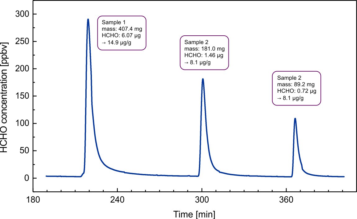 The thermal extraction method evaporates the total formaldehyde content. When the concentration is plotted vs. time, this results in a concentration peak with exponential decay. The total formaldehyde content is given by the integral over this peak. The figure below shows typical emission peaks of thermal extraction at 120°C (parts of smurfs, plastic toys).