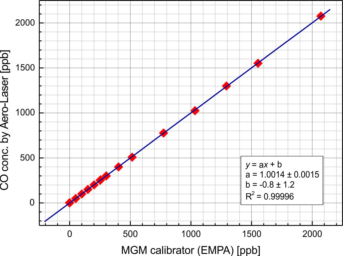 The fluorimetric detection of carbon Monoxide (CO) is linear over several orders of magnitude.This was tested by the Eidgenössische Materialprüfungs- & Forschungsanstalt in Dübendorf, Switzerland. The data presented below is from two correlation tests run with two different calibrations for high and low levels, respectively. The result shows an excellent linearity of the Aero-Laser CO-analyzer family.