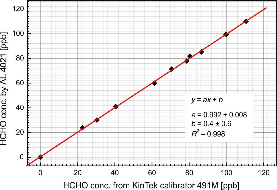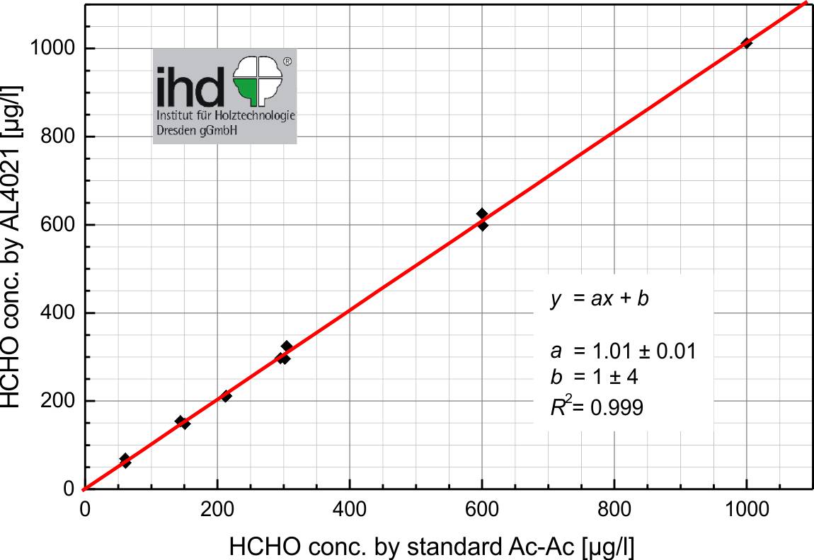 The AL4021 formaldehyde monitor replaces the conventionally employed Hantzsch method carried out by wet chemistry (e.g. flask method) in combination with colorimetric detection of DDL. A comparison of HCHO concentrations of the very same samples measured by both, the AL4021 and the flask method, reveals a very good correlation of 1. Data was provided by courtesy of the Institut für Holzforschung IHD, Dresden, Germany.